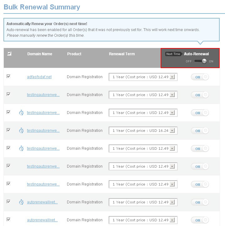 A Customer / Sub-Reseller can also turn Auto-Renewal ON for a particular Order while manually renewing it. If the Customer/Reseller turns Auto-Renewal ON, then the system will attempt to Auto-Renew that Order next renewal cycle onwards. Hence, the Customer/Reseller must complete the current process of manual renewal.