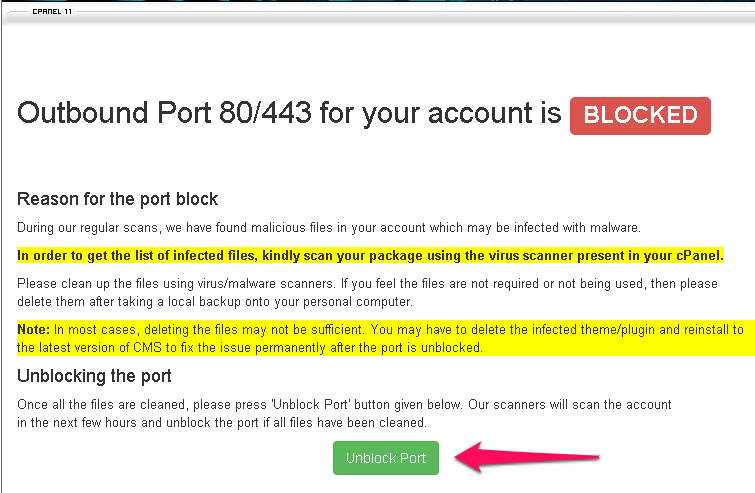 Our scanners will now scan your website and automatically unblock the port if your files are clean. The below message will appear in your cPanel interface on a successful unblock.