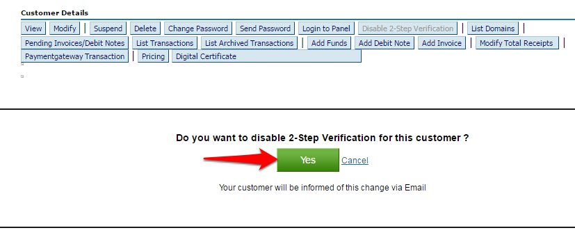 Your Customer / Sub-Reseller will be sent an email notifying them that 2-Step Verification was disabled for their account.