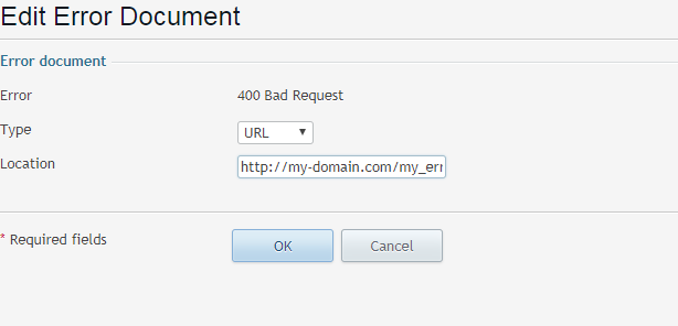 Example: Your domain name is example.com, and you have created a file named badrequest_400_1.html and saved it in the httpdocs\my_errors directory. To use this file as an error document, you need to type the following URL into the Location field: https://example.com/my_errors/badrequest_400_1.html.