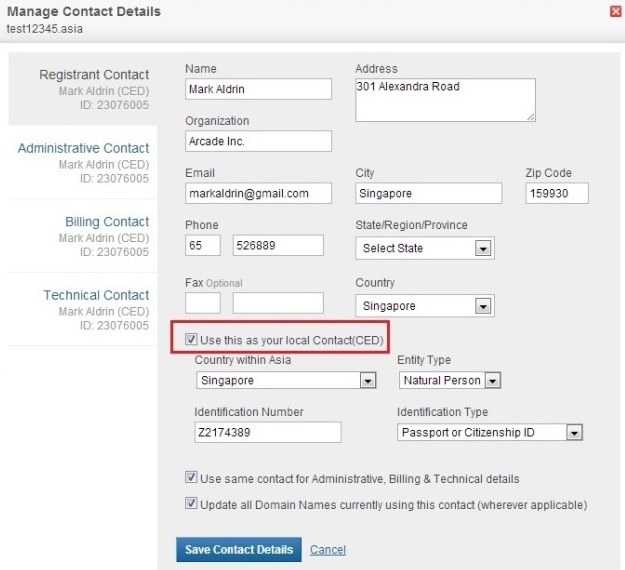 (CED). Here, you may modify the CED Contact specific details. You may also select one of the other Contacts (Registrant, Administrative, Billing or Technical) as the CED Contact for the domain name. For this, click the specific Contact, select the Use this as your local Contact(CED) checkbox. If the newly selected Contact has never been used as a CED Contact before, you would be prompted to provide additional information, so as to declare that this Contact is a legal entity within the DotAsia Community. Provide the details.