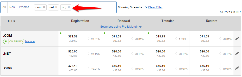 • Search and Bulk update prices for a set of TLDs using the profit-based pricing tool