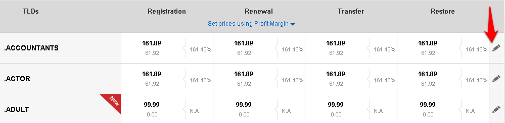 With the bulk pricing tool, you can do a bulk search for the TLDs, specify your profit margin and the system will calculate and set your selling prices accordingly.