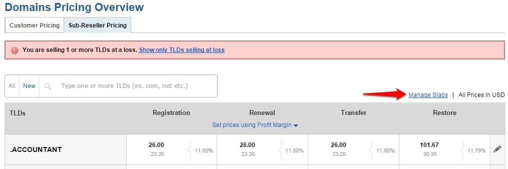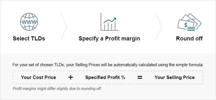 With the bulk pricing tool, you can do a bulk search for the TLDs, specify your profit margin and the system will calculate and set your selling prices accordingly for all Slabs.