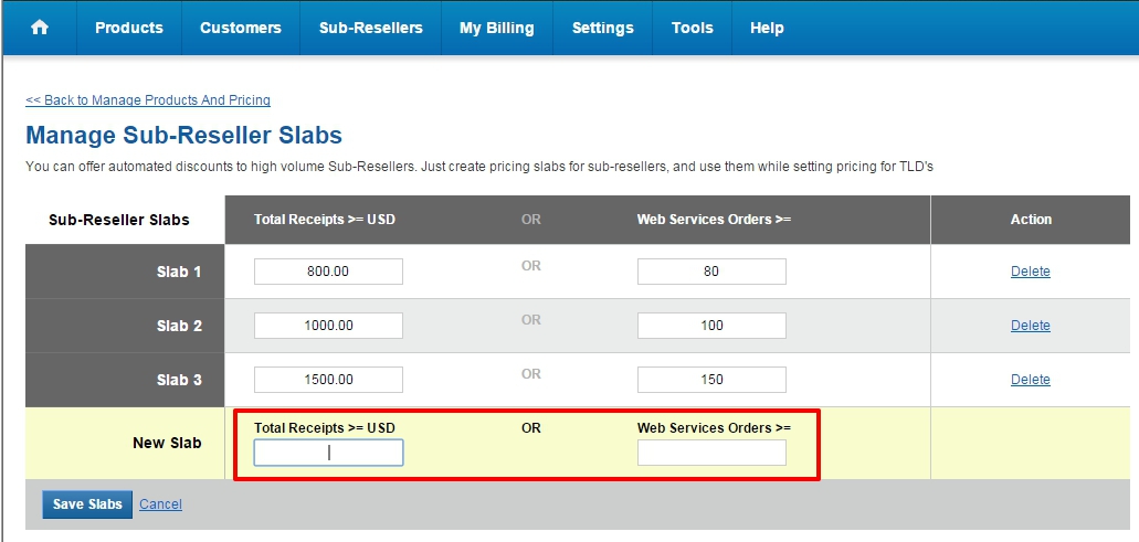 You may set Pricing Slabs depending upon the Total Receipts of your Sub-Resellers or the number of Web Services (Email Hosting + Windows Web Hosting + Linux Web Hosting + Website Builder) Orders purchased by your Sub-Resellers. The Selling Price to each Sub-Reseller is determined at the time of purchase depending upon the Total Receipts, the number of Web Services (Email Hosting + Windows Web Hosting + Linux Web Hosting + Website Builder) Orders, your Slab Pricing and the Sub-Resellers' Specific Pricing.